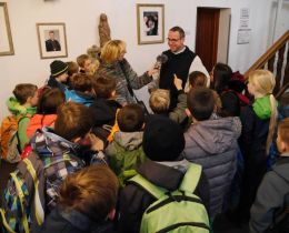 Mit dem Bus ging es nach Langwaden. Dort hatte sich Pater Gregor viel Zeit genommen und erklärte mit einer Engelsgeduld alles, was die Kinder wissen wollten. Nach einer kurzen Führung durch das Kloster durften wir sogar am Mittagsgebet der Mönche teilnehmen. Alle Kinder waren mucksmäuschenstill und lauschten andächtig den Gesängen, aber auch der Stille. Gar nicht so einfach!!!