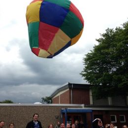 Während der Projektwoche hatten Eltern mit Kindern 2 große Heißluftballons zusammengeklebt - und die durften jetzt gen Himmel schweben. Gottseidank machten Regen und Wind zwischendurch eine Pause, so dass dem Flug nichts im Wege stand.
