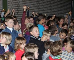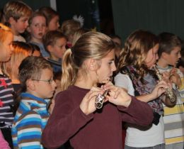 Das gemeinsame Singen aller Kinder wurde von unseren Querflöten eingeleitet. Sie hatten fleißig geübt und konnten das Martinslied prima spielen. Zum Lied 'Wir tragen dein Licht in der Dunkelheit' holten alle Kinder kleine Lichter hervor und zum Abschluss leuchtete die Mondlaterne zum Lied vom Mann im Mond. Schließlich hatten sich alle Mitsänger einen Weckmann und Kakao verdient!