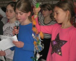 Die Kinder der Klasse 1 haben das Bilderbuch ‚Hermeline auf Hexenreise‘ gelesen. Alle Kinder standen auf der Bühne und jeder traute sich, vor großem Publikum zu sprechen. Sie stellten den Inhalt des Buches vor, zeigten ihre Lesetagebücher und die dazu gebastelten tollen, riesengroßen Zauberstäbe.