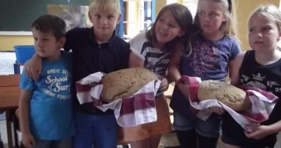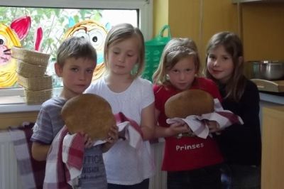 Insgesamt 12 Kinder haben sich in dieser Woche daran beteiligt, verschiedene Brotsorten selbst zu backen. Nachdem Roggen- und Weizenkörner mit Handgetreidemühlen zu Schrot und Mehl verarbeitet waren, setzten wir daraus Sauerteig an.