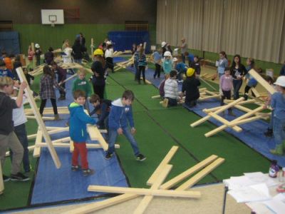 Nach anfänglichen kleinen Schwierigkeiten arbeiteten die Kinder in den Gruppen immer besser zusammen: Teamarbeit und das Verständnis für die Lage der Balken waren entscheidend für den schnellen Aufbau. Letztendlich wurden die schnellsten 3 Mannschaften ermittelt und geehrt – aber tatsächlich gewonnen haben alle Kinder.
