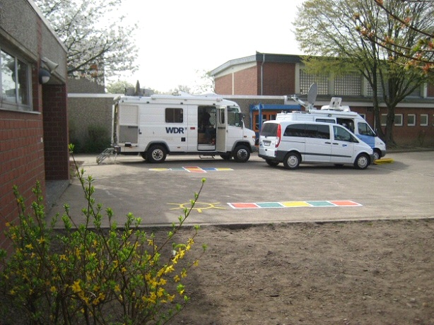 Mittags fuhren schon die Ü-Wagen vor und bauten die umfangreiche Technik im Klassenraum auf.