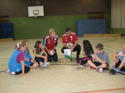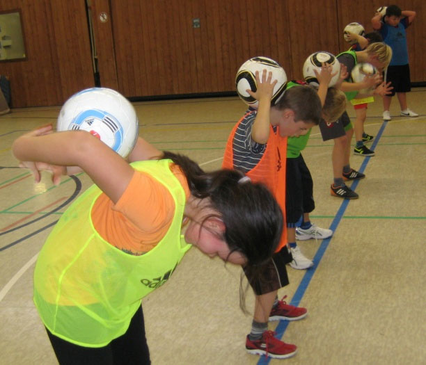 Am Montag, den 4.11.13 besuchte uns das DFB-Mobil in der 5. und 6. Stunde. Wir rannten aufgeregt zur Turnhalle und zogen uns um. In der Halle begrüßten uns Elke und Erkan. Zum Aufwärmen begannen wir mit einem Spiel. Jeder holte sich ein farbiges Leibchen und lief damit in der halle herum. Rief Elke ‚Tauschen’, musste man schnell mit einem anderen das Leibchen tauschen. Bei ‚Alarm’ musste jeder zu einer Matte rennen, auf der ein leibchen mit der Farbe lag, wie das, welches man in der Hand hatte. Der Letzte musste mit seiner Mannschaft eine schwierige Turnübung machen . Anschließen spielten wir das Spiel auch noch beim Dribbeln mit Fußbällen. Das war lustig und hat allen Spaß gemacht. Dann wurden wir in 4 Mannschaften aufgeteilt. Jeweils zwei Mannschaften haben gegeneinander Fußball gespielt. Mein blaues Team hat gegen das orangene Team beide Spiele gewonnen. Ich habe zwei Tore geschossen. Nach den Fußballspielen haben wir Übungen mit dem Ball gemacht. Diese waren am Anfang einfach und wurden dann immer schwerer, Als letztes spielten wir noch das Spiel ‚Eckenfußball’. Zum Schluss bekam jeder noch Buntstifte und einen Aufkleber vom DFB. Es waren zwei lustige, anstrengende und aufregende Stunden.