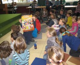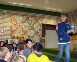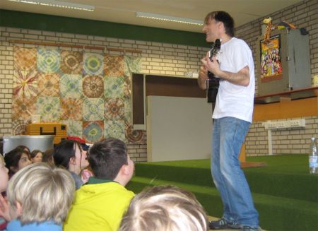 Wieder einmal hatten wir einen echten Schriftsteller zu Gast. Thommi Baake las im 1. und 2. Schuljahr eine Piratengeschichte vor und band alle Kinder mit vielfältigen Aktionen in das Geschehen ein. Das 3.und 4. Schuljahr kam in den Genuss, mit seinem neuesten Buch "Die Rückkehr der Leuchtgiraffen" bekannt zu werden und die bislang unbekannte Sorte der "Leuchtgiraffen" etwas näher kennenzulernen. Alles wurde mit großer Geste und viel Humor vorgetragen, so dass alle Kinder ihren Spaß an den Geschichten hatten. Zwischendurch wurde gemeinsam gesungen und schließlich konnte jede Klasse stolz ein handsigniertes Plakat mit in die Klasse nehmen.