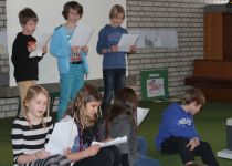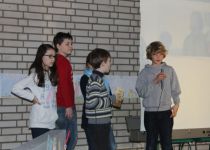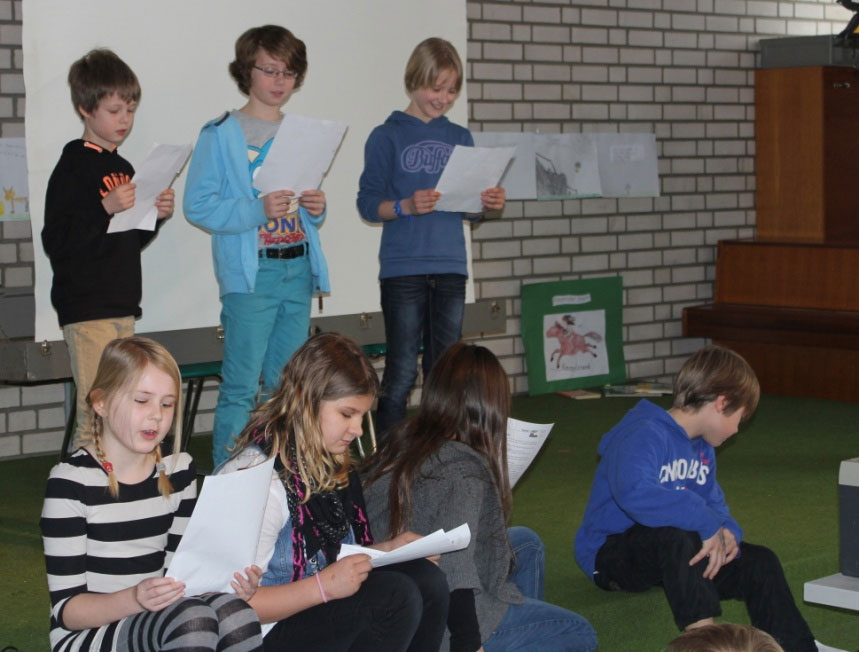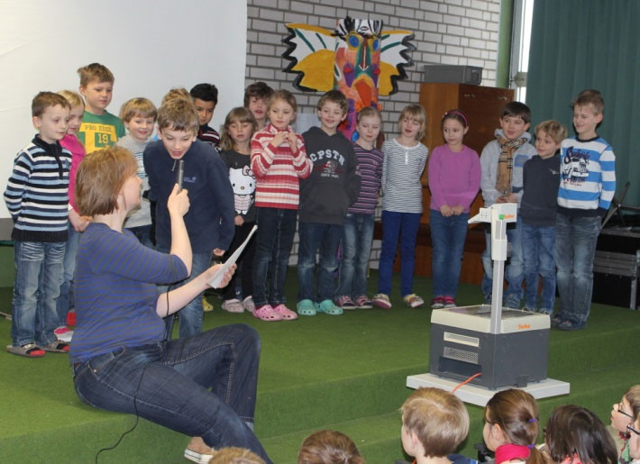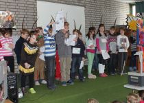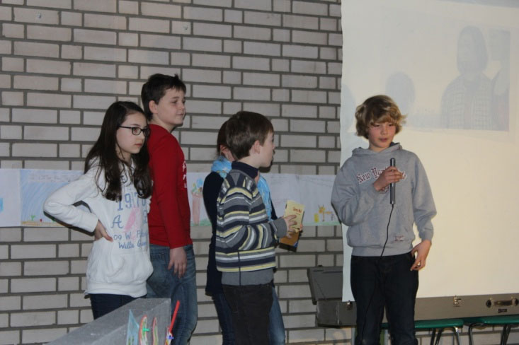 Nachdem Thommi Baake alle Kinder so richtig zum Lesen animiert hatte, wurden in jeder Klasse gemeinsam ein Buch gelesen und dazu eine Menge Aktionen veranstaltet. Am 12.3. fanden sich dann alle Kinder zur Präsentation in der Aula ein, um zu hören und zu sehen, was die anderen Klassen gemacht hatten und ihr eigenes Projekt zu präsentieren.