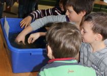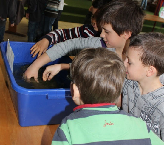 Zum Schluss war die Klasse 4b an der Reihe. Sie leiteten ihre Präsentation mit Walgesängen von der CD ein und berichteten dann von ihrer Lektüre: "Sams Wal" von Katherine Scholes wurde nur bis zur spannendsten Stelle vorgestellt. Den hoffentlich guten Ausgang der Geschichte sollen alle Kinder selbst lesen. Dafür durften aber alle Kinder erspüren, wie sich eine Walhaut anfühlt.