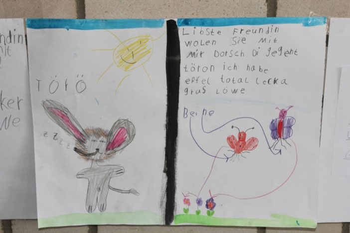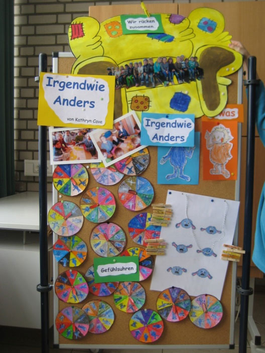 Die Klasse 1a begann und stellte das Buch "Irgendwie Anders" von Kathryn Cave vor. Sie hatten dazu jede Menge gebastelt und ein Sofa gemalt, auf dem die ganze Klasse eng zusammenrückte.