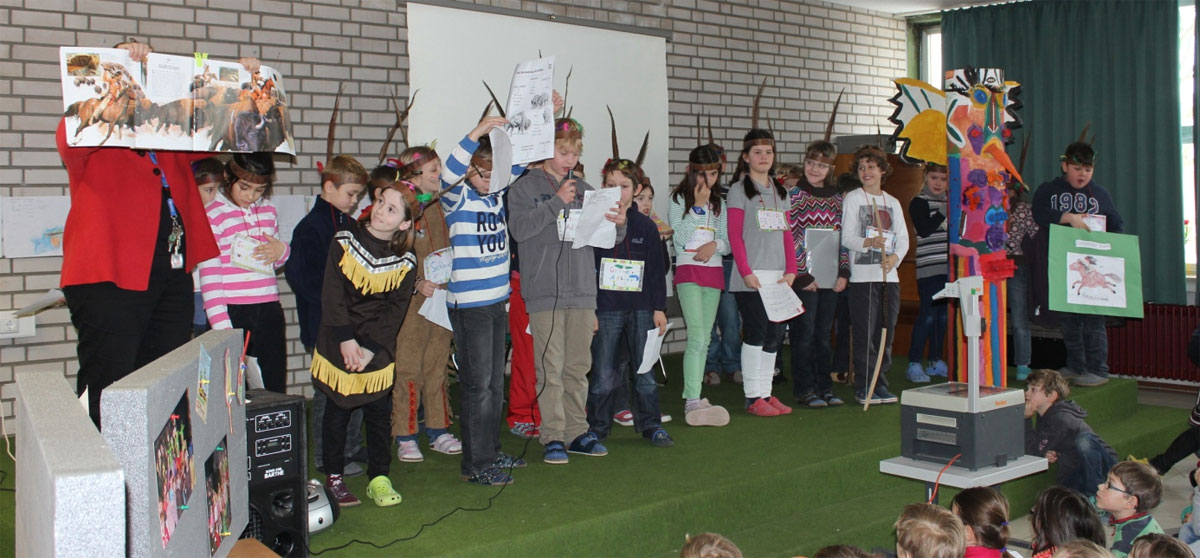 In der Klasse 3 war das große Thema der vergangenen Woche "Indianer". Passend zum Buch "Fliegender Stern" von Ursula Wölfel informierten sich die Kinder umfassend über das Leben der Indianer und gaben diese Informationen an alle Kinder weiter.