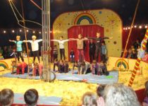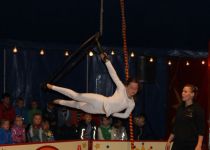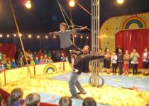 Schlag auf Schlag folgte ein Höhepunkt dem nächsten: Die Tellerdreher konnten sich mitsamt Stab und Teller in unterschiedliche Positionen bewegen, ohne dass der Teller herunterfiel. Nun gab es wieder etwas zu Lachen: Die schlauen, schlauen Auguste wussten auf alle Fragen eine Antwort – und die waren echt lustig! Nach der Pause folgten dann die Seilläufer, die tatsächlich mit nur ganz wenig Unterstützung auf dem dünnen Drahtseil balancierten und einige Kunststücke zeigten. Bei den Zauberern danach wurde ein Mädchen aus der Kiste weggezaubert und als großen Höhepunkt zeigten die furchtlosen Feuerschlucker, dass ihnen die Hitze des Feuers auf der Haut nichts ausmachte.