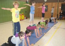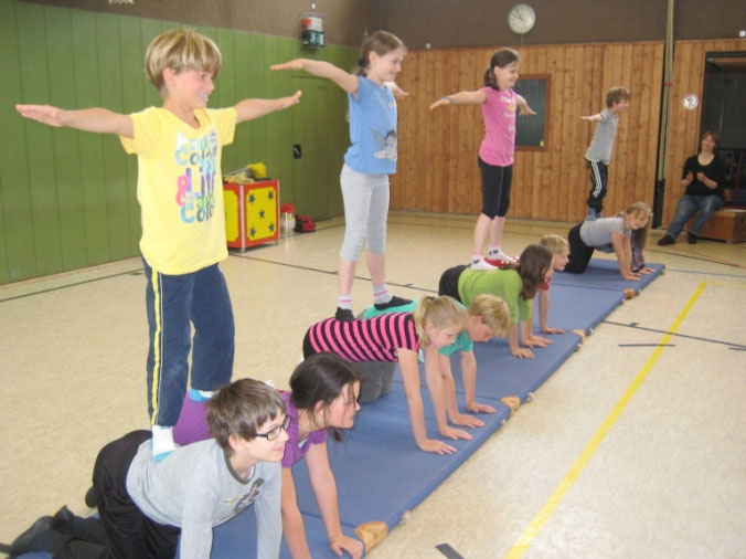 Ab Dienstag wurde dann eifrig trainiert, sowohl im Zelt als auch in unserer Turnhalle. Jede Nummer nahm mehr und mehr Gestalt an, wobei es den Lagrins vor allem darauf ankam, dass die Kinder sich selbstbewusst präsentierten, aufeinander in der Gruppe achteten und jedes Kind sich bestmöglichst in Szene setzte.