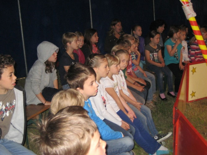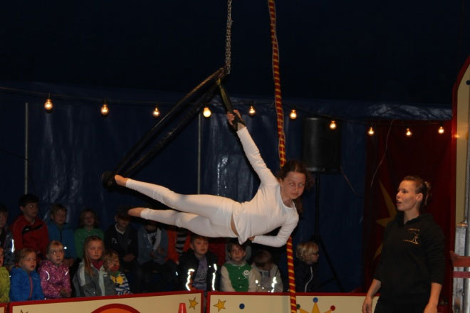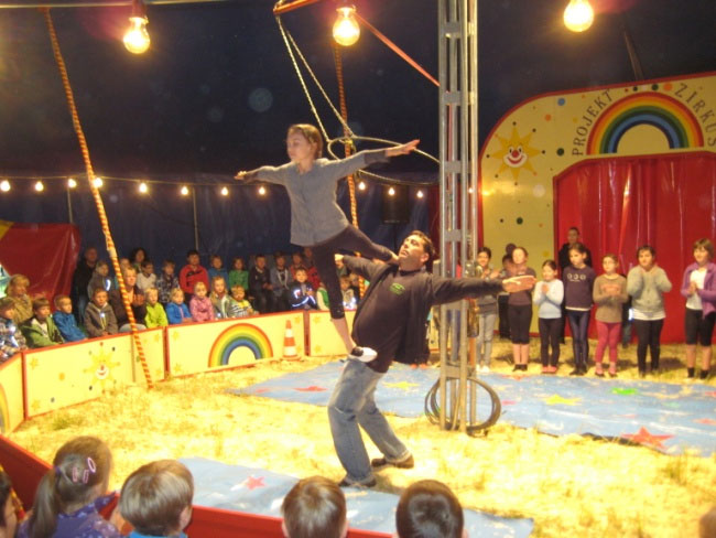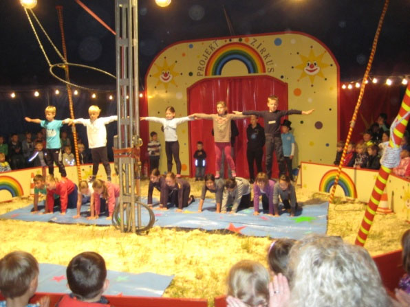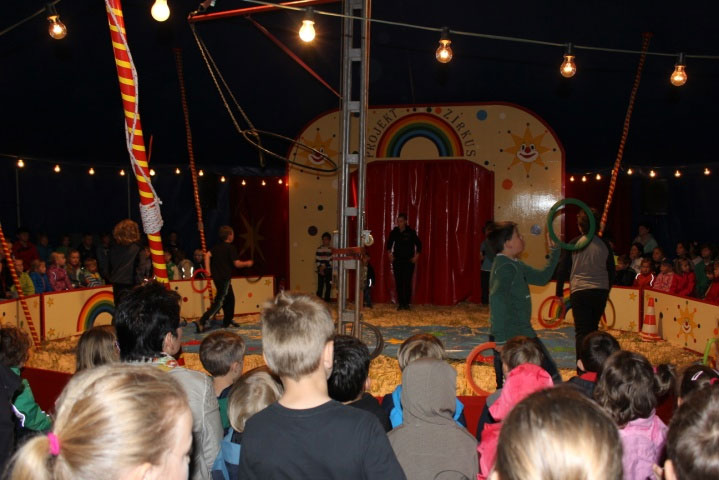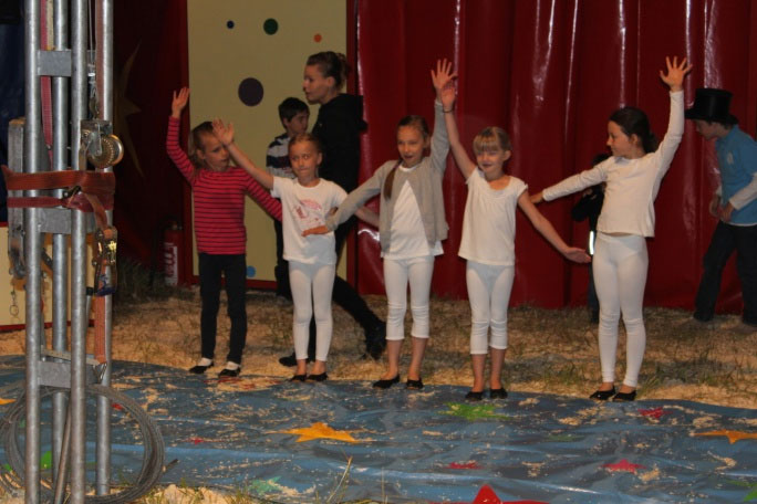 Als erstes stürmten die tollkühnen Akrobaten die Manege und zeigten viele verschiedene Pyramiden, bei denen es auf besonders gute Teamarbeit ankam. Dann kamen die Jongleure, die tolle Kunststücke mit den Ringen zeigten. Jetzt wurde das Publikum durch 3 Clowns erfreut, die mit viel Witz und Geschick eine Möhre unter dem Tuch hervorzauberten. Die Luftakrobaten im Ring zeigten großes turnerisches Geschick und brachten so manches Oh! Und Ah! bei den Zuschauern hervor. Als Zugabe stand ein Mädchen freihändig auf den Schultern von Herrn Lagrin und die beiden liefen durch die Manege. Auch bei der ‚Galionsfigur’ bewiesen die Kinder große Körperspannung und Mut.