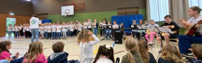 Gemeinsam machten wir auch noch Musik: Alle Kinder sangen die 'Ode an die Freude', wurden von den Streichern begleitet und machten mit den (Europa-)Sternen eine schöne Choreographie dazu.