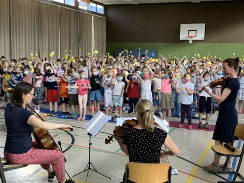Jetzt endlich konnte das lange geplante - und durch Corona immer wieder verschobene - Konzert von Mitgliedern des WDR-Sinfonie-Orchesters bei uns stattfinden. Im Rahmen der sogenannten 'Dackl'-Konzerte kamen 3 Streicherinnen zu uns, die ihre Instrumente erklärten, Fragen der Kinder beantworteten und vor allem: wunderschöne Musik machten!