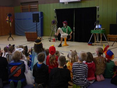 Als Höhepunkt kam auch noch ein Clown dazu, der in der Turnhalle zur Freude aller sein Unwesen trieb. Er hatte tolle Kunststücke dabei und war dabei oft so tollpatschig, dass die Kinder (und Lehrerinnen) ihn mehrfach kräftig unterstützen mussten.