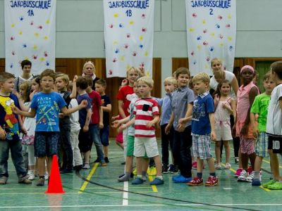 Dann ging es an die Kletterstationen: Wegen des unsicheren Wetters hatten wir das Kistenklettern und das Bogenschießen in den Turnhallen aufgebaut, Monkeyclimbing und Slackline fanden draußen statt.