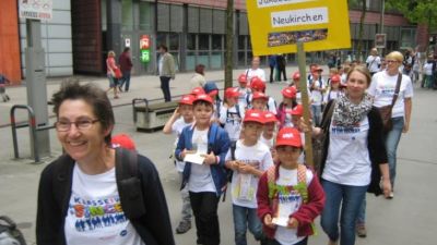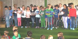 Seit vielen Wochen übten wir die 18 Lieder, die bei dem Konzert gesungen wurden und alle Kinder waren inzwischen melodie- und textsicher. Vom Titelsong über Spaßlieder wie ‚Tante aus Marokko‘ und ‚Meine Biber haben Fieber‘, englische Lieder wie ‚If you’re happy‘, ‚Morning has broken‘ und ‚I like the flowers‘ bis hin zu alten deutschen Volksliedern wie ‚Kein schöner Land‘ und ‚Der Mond ist aufgegangen‘ wurde ein breites Spektrum von wirklich schönen Liedern gesungen, die den Kindern, aber auch den zuhörenden und mitmachenden Erwachsenen sehr viel Spaß gemacht haben.